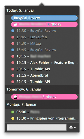 Über das Eingabefeld am unteren Rand lassen sich, ebenfalls ähnlich Fantastical, auch Events anlegen – in natürlicher Sprache. Zumindest halbwegs. Da Software dieser Art primär für den englischsprachigen Markt ausgelegt ist, funktioniert so etwas mit Deutsch gerade so zufriedenstellend. Ist bei BusyCal nicht anders als bei iCal. Besser man hält sich an ein Format wie
