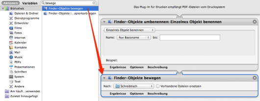 Anschließend suchst du in der Bibliothek nach der Aktion Finder-Objekte umbenennen und ziehst sie in das Feld rechts daneben. Diese Aktionen verwenden wir, um der zu erstellenden PDF-Datei einen Namen zu geben.